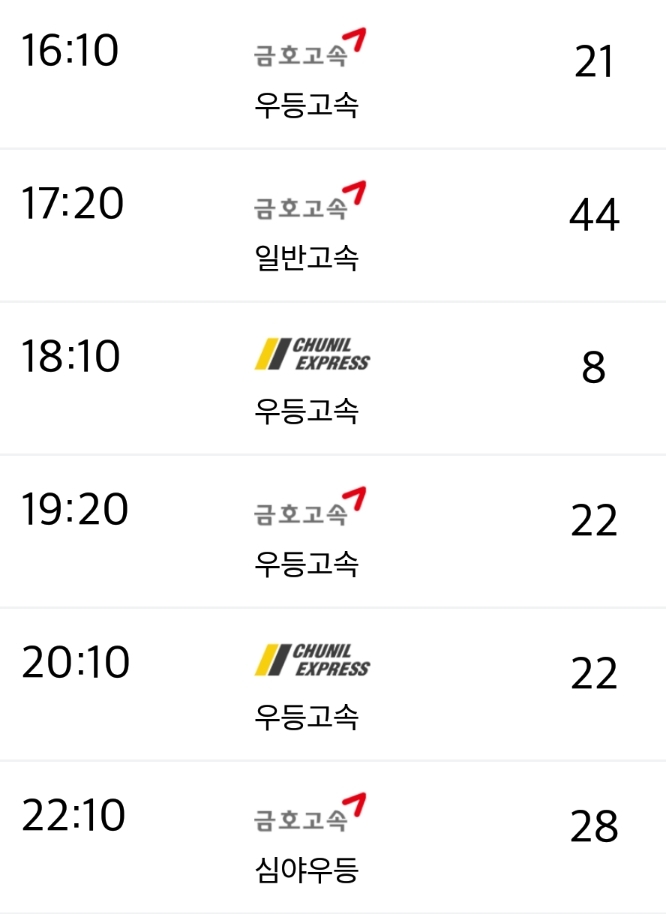 막차시간 : 18:10(우등)